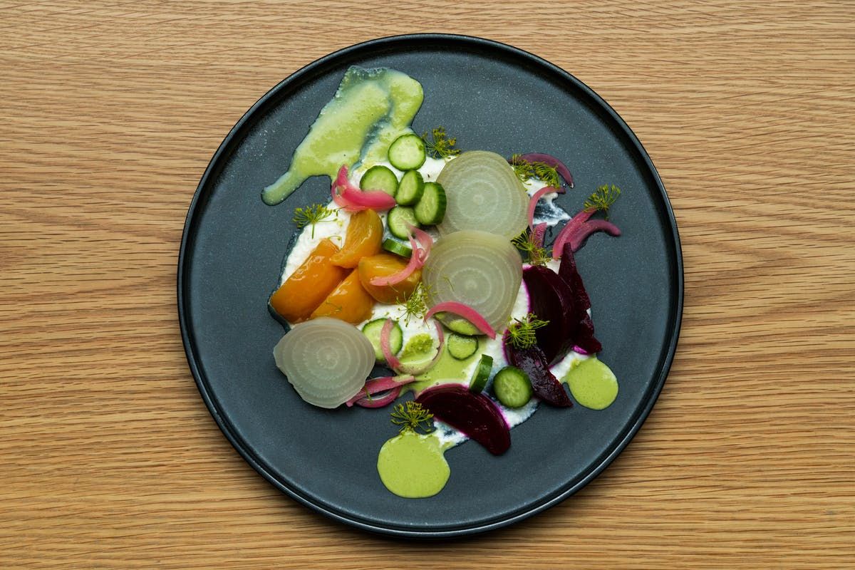 The interior is a stylish designer space where you can enjoy a relaxed meal while overlooking the rooftop garden. We use seasonal ingredients sourced from local producers to offer Kyoto cuisine with a California taste. The menu includes a wide variety of dishes such as roasted Hokkaido pork shoulder, seared Spanish mackerel, and charred Kujo scallion focaccia. We also have an extensive drinks menu featuring natural wines, organic wines, and craft beers.