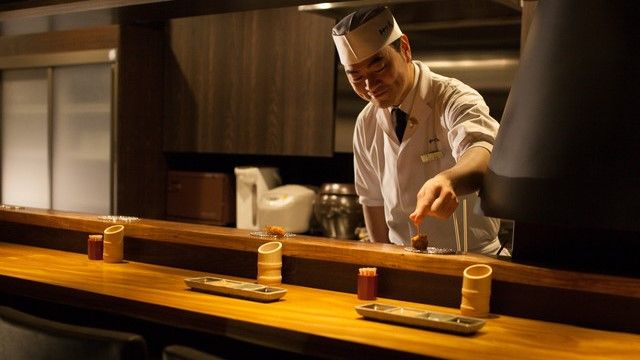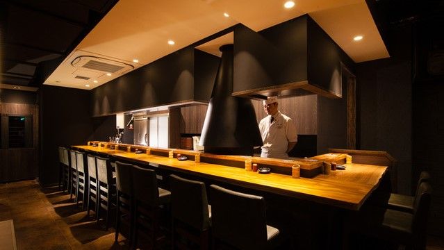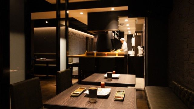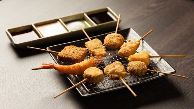 地下1階の店内には上品な黒をベースにした内装が広がっています。ほどよい照明と落ち着きのある空間で、おしゃれに串カツを楽しむことができます。カジュアルなイメージがある串カツですが、選りすぐりの高級食材を使用しており、グルメな方にもご満足いただけます。黒毛和牛や生ウニ、天使のエビなど、一つ一つの素材の味わいを堪能することができます。ビールはもちろん、ワインにも合う串カツを味わってください。