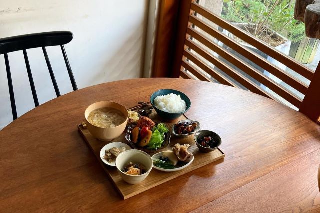 野菜を中心に、季節の身体に合わせた養生ごはんにデザートとお飲み物のセットです。