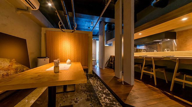 剥き出しのコンクリートと配管の中に現れた居心地の良い空間は、背徳感と癒しが融合した大人の隠れ家。木目が美しいテーブルとチェアは、来客をアットホームに迎え入れてくれます。 炭火焼きやロースト、パスタなど、北海道の旬の食材を使ったイタリア料理をお楽しみいただけます。イタリア産やフランス産など、ソムリエが厳選したワインもご用意しておりますので、お食事と一緒にご堪能ください。