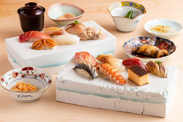 都心の大通り沿いに建つビルの6階にある引き戸をくぐると、檜のぬくもりを感じる純和風の落ち着いた空間が広がります。メニューはコース料理のみです。食材へのこだわりはもちろん、適切な旨味のでる時期を見計らった寝かせにこだわる江戸前技法を用いた最高の鮨を提供。羽釜で炊いたシャリも、赤酢と白酢の塩梅を引き立てた一本にこだわっています。ソムリエが厳選した日本酒やシャンパン、ワインの用意もありますので最高級の鮨と共にお楽しみください。